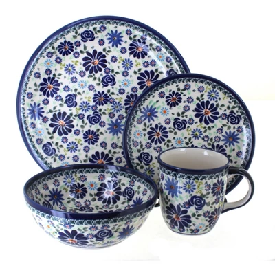 4 Piece Place Setting – includes 1 dinner plate, 1 dessert plate, 1 cereal/soup bowl, and 1 coffee mugDinner Plate – 10.75″ diameterDessert Plate – 7.5″ diameterCereal Bowl – 18 oz. capacity, 6.7″ x 2.6″Coffee Mug – 12 oz. capacity, 3.75″ high The Art of Polish Pottery, as we know it today, started as local folk art centuries ago in the German province of Silesia. The first known pieces of “Bunzlauer” stoneware dating back to the 16th century were crafted by hand and decorated with a folk art stamping technique using potatoes. Original designs were inspired by the peacock feather using the colors of cobalt blue, sage green and ferrous red. These designs and colors are still the inspiration for modern day patterns.Today, skilled Polish artists still individually handcraft and hand decorate each piece using small sponges to stamp each pattern and color. After the process of mixing ingredients, molding the pottery, applying the decorations and glaze, the pottery is twice fired. This process makes the pottery extremely durable, it will not crack or chip easily, and it is perfect for use in the microwave, dishwasher, oven and freezer. Along with our pottery, we have sourced a range of absolutely beautiful hand blown glassware from Poland. It is the perfect addition to your Polish Pottery Collection!